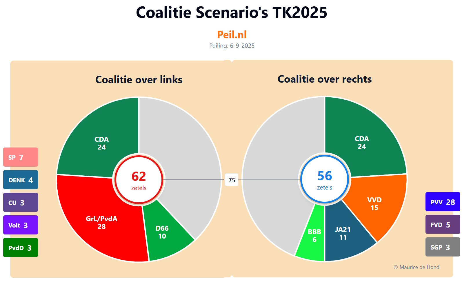 Het zou me niets verbazen als de VVD uiteindelijk overstag gaat en vanwege "het landsbelang" toch in een coalitie met PvdA/GL, CDA en D66 terecht komt. Dat met een hele grote PVV in de oppositie waarbij Wilders kan prijsschieten op de regering.Marnix schreef:Klopt. Vooral de VVD zit in een enorme spagaat. Ze willen niet weer met Wilders in zee maar ook absoluut niet met GL / PVDA onder Timmersmans. Ik denk dat ze het liefst de oppositie in zouden gaan, maar zonder VVD, ook in gedecimeerde vorm wordt het vormen van een coalitie vrijwel onmogelijk. Je hebt dan partijen nodig die een beetje in het midden zitten.