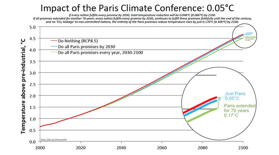 elbert schreef:De 0,00003 graden heb ik van wetenschapsjournalist Marcel Crok, die zich baseert op dezelfde klimaatmodellen als waarmee ons allerlei klimaatrampen worden voorgespiegeld. Dat komt helemaal overeen met de berekeningen die aantonen dat als de hele wereld zich aan het klimaatakkoord van Parijs zou houden, de wereld zo'n 0,05 tot 0,17 graden minder in 2100 zou opwarmen. Dat is helemaal niet meetbaar.