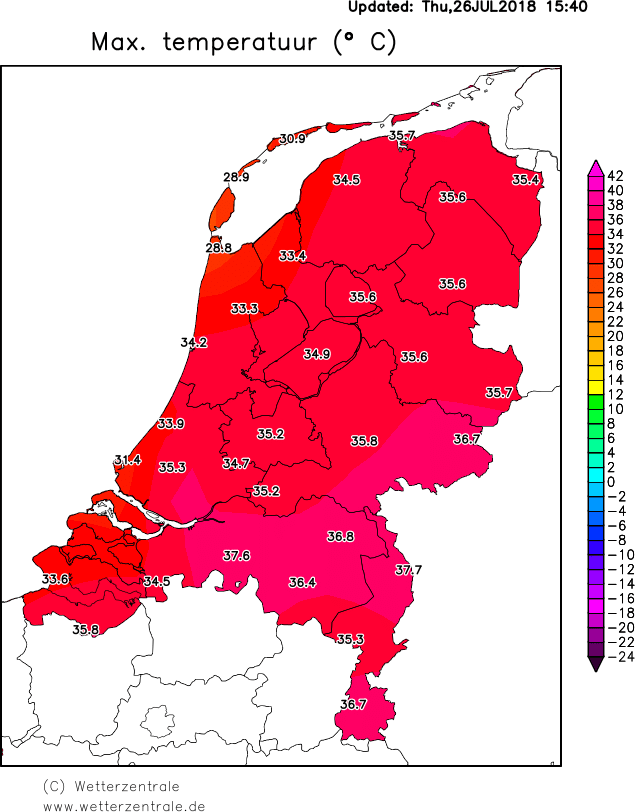 Arcen piekt 37,7 graden, Gilze-Rijen 37,6. Zien we toxh niet vaak. Door toenemende bewolking lijkt de max nu wel bereikt en zakken de temperaturen momenteel weer wat.